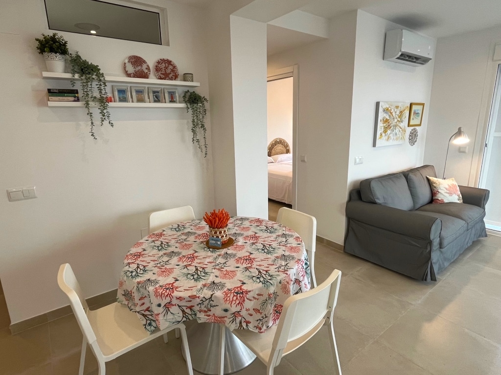 The apartment has an open plan kitchen towards the living room which has access to the lovely outside terrace, where you can sit and enjoy a glass of wine and take in the views.