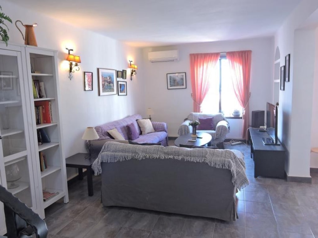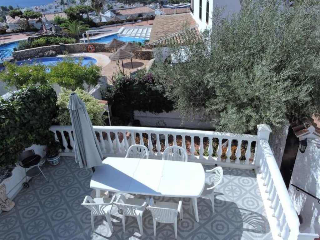 In the main house, you will find a bright lounge with cable TV (main English channels), dining area, and a fully-equipped kitchen (dishwasher & washing machine), as well as a downstairs WC. From the living area doors lead out onto a large terrace, equipped with table and chairs, and parasols. From here you have lovely sea views and you also overlook the communal swimming pools.